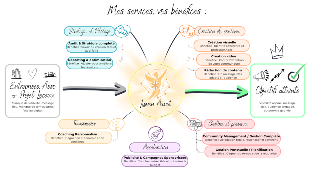 Prise en charge de l’ensemble de votre présence en ligne : planification et publication de contenus, modération des interactions, animation de vos réseaux sociaux et suivi des performances. Bénéfice client : déléguer entièrement la gestion de vos réseaux, rester cohérent et actif, tout en engageant votre audience efficacement.